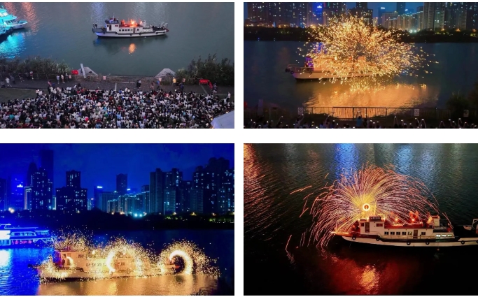 假期期間,南寧旅發(fā)公司在孔廟旅游碼頭為市民游客們獻(xiàn)上這一幕“火樹銀花一朝落,萬點(diǎn)星辰漫天散”的美景。