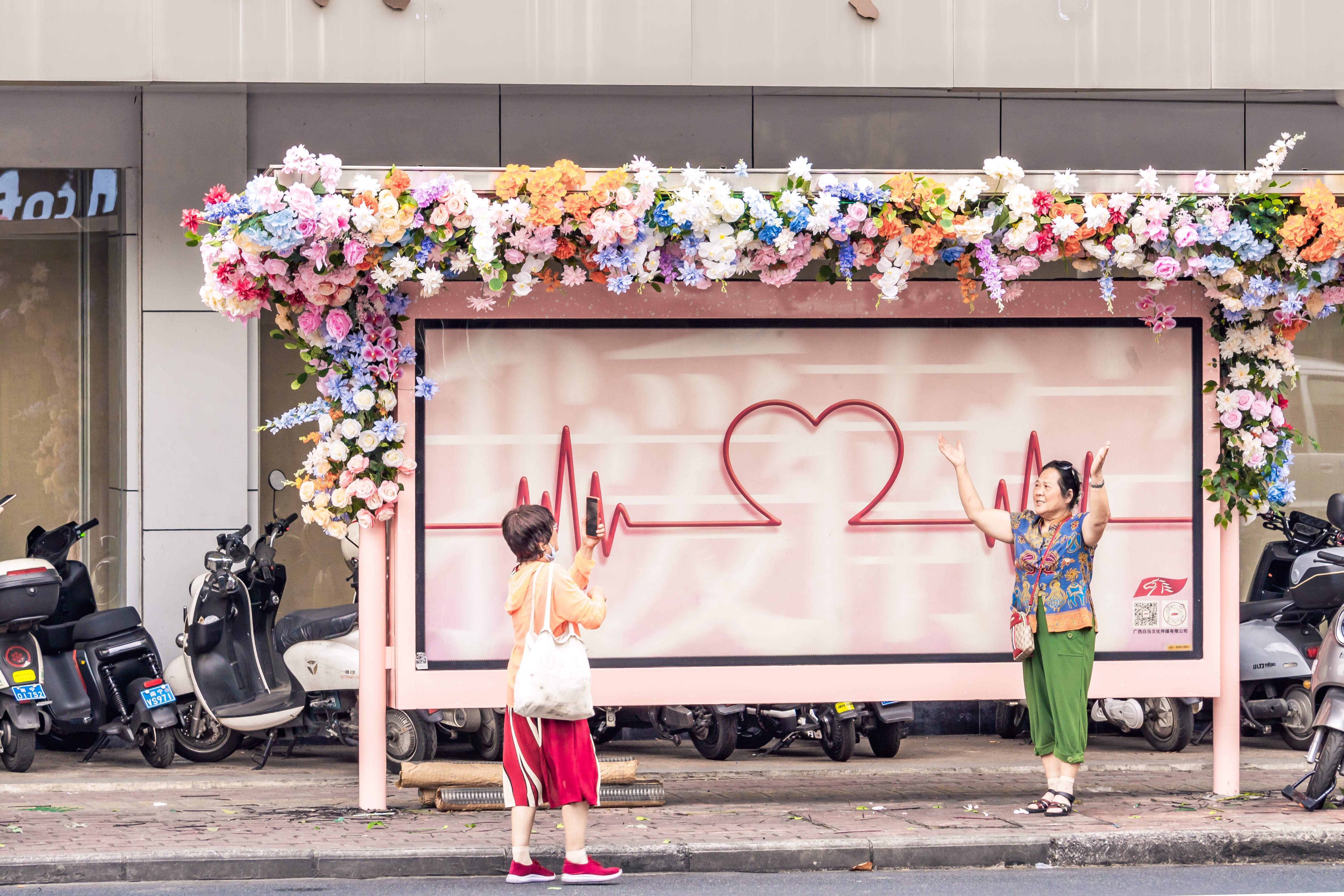 繁花裝扮的公交候車亭采用了絢麗多彩的花卉設計,讓原本普通的候車亭煥然一新,成為南寧街頭一道亮麗的風景線,受到了眾多市民的認可和喜愛,也成為市民520的打卡地。路人紛紛駐足欣賞,更有許多年輕人專程前往打卡拍照,感受南寧的浪漫與美好。